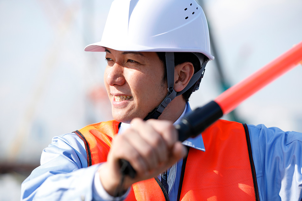 道路工事・建設現場などにおける、資材・機材の搬入時、工事作業時に、全員が安全に通行できるよう誘導いたします。工事現場は“安全第一”です。事故が絶対に起きないよう、常に神経を研ぎ澄ませ警備いたします。