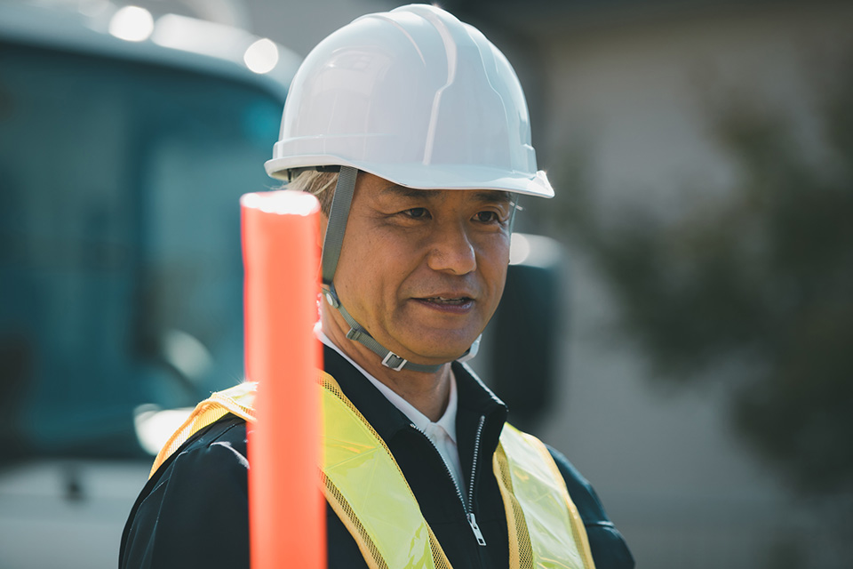 道路工事・建設現場などにおける、資材・機材の搬入時、工事作業時に、全員が安全に通行できるよう誘導いたします。工事現場は“安全第一”です。事故が絶対に起きないよう、常に神経を研ぎ澄ませ警備いたします。